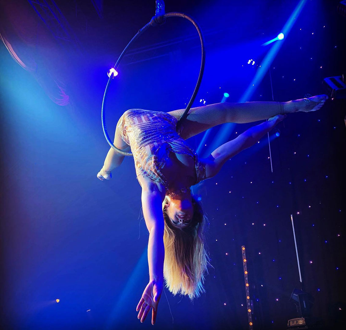 «Accompagnez votre show de cerceau aérien par une constellation d’artistes circassiens entre contorsionniste roue Cyr et mât chinois. Une soirée intense où virtuosité aérienne et énergie scénique transforment votre événement en spectacle total.»